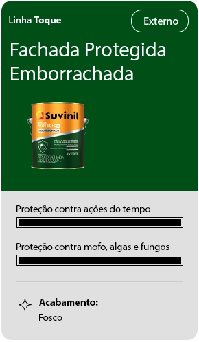 A parte de fora da casa está sempre exposta à poluição, à chuva e ao sol, que podem prejudicar a pintura, causando desgastes ao longo do tempo. Por isso, nossa tinta emborrachada para parede externa entrega nível máximo de proteção contra os eventos comuns da natureza, mantendo sua parede bonita por mais tempo.