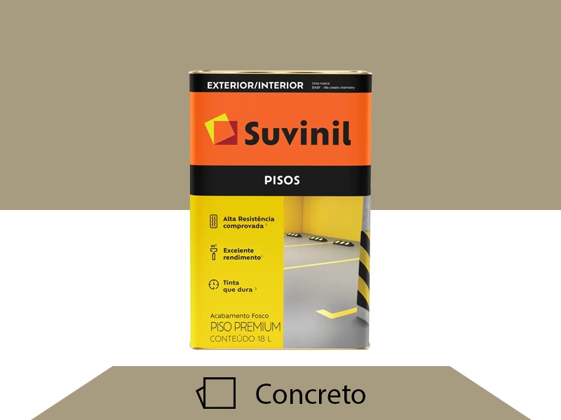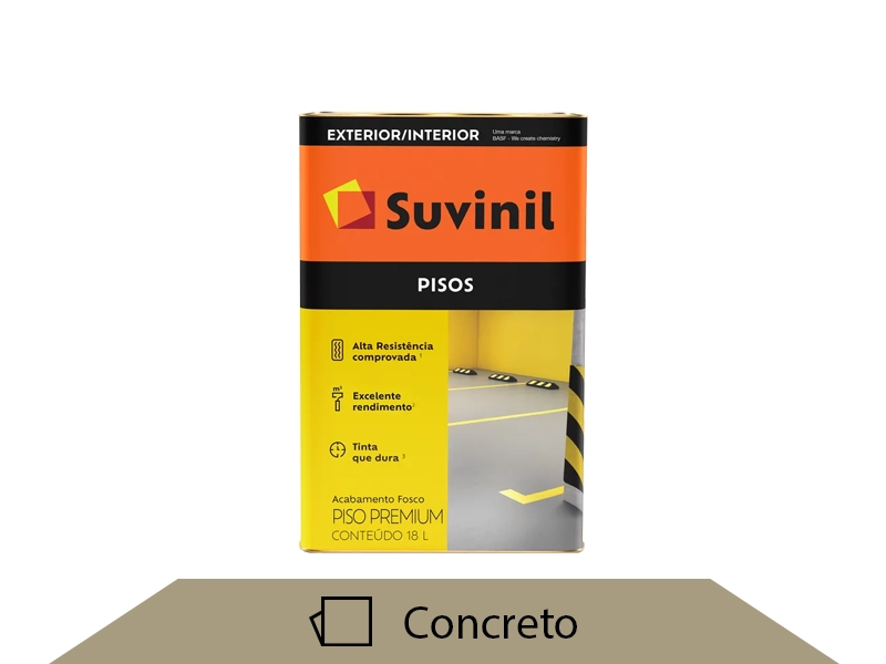 Suvinil Pisos é uma tinta acrílica de acabamento fosco. Tinta para piso de cerâmica, piso de cimento, garagem, calçada, quadra, área de lazer e até escadas. É um produto de fácil aplicação, com alta cobertura e ótima resistência contra as ações do tempo e passagens de pessoas e carros. Sua versatilidade o ajuda na hora de decorar e compor o ambiente.